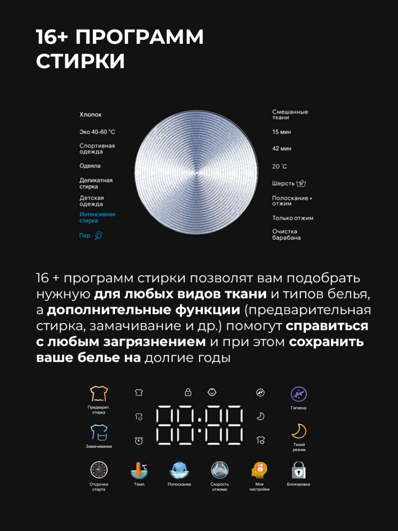 - 16 автоматических программ справятся с любыми загрязнениями на любом типе ткани и виде одежды. Дополнительные функции позволят вам самостоятельно выбрать оптимальные параметры стирки (дополнительное полоскание, регулировка температуры и оборотов отжима, предварительная стирка или замачивание, отсрочка старта).