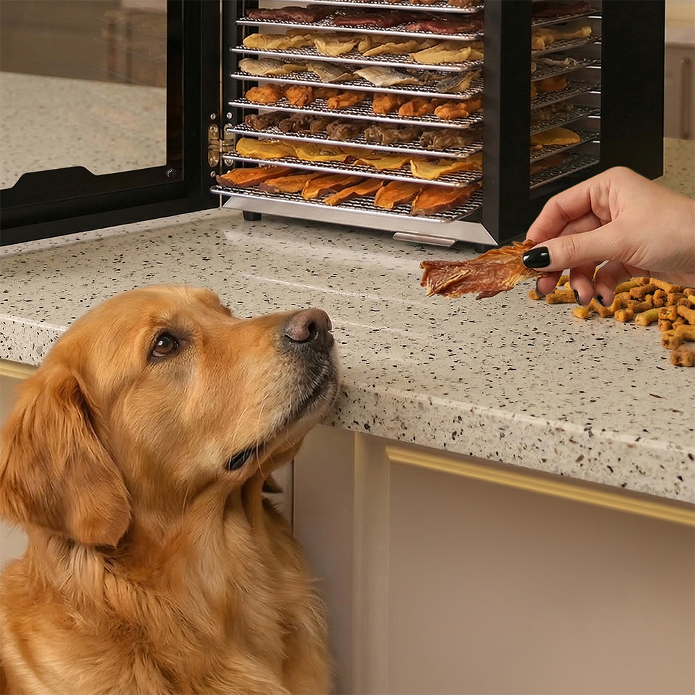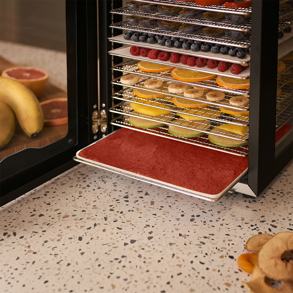 Чёрный корпус из нержавеющей стали, устойчивый к нагреву, влаге и коррозии, выглядит лаконично и современно, легко вписывается в интерьер кухни или мастерской. Внутри установлено 12 поддонов из нержавеющей стали с зазором 25 мм — этого достаточно, чтобы удобно размещать ломтики фруктов, травы или мясные полоски.